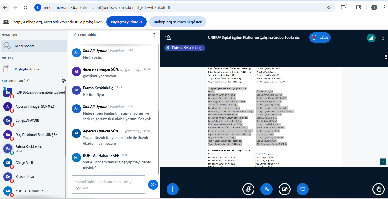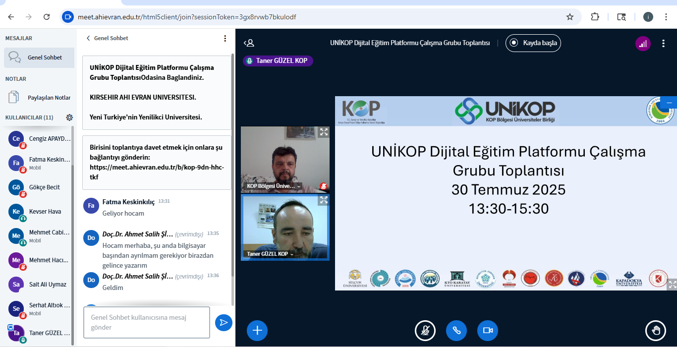 Dördüncü toplantı Dijital Eğitim Platformu Çalışma Grubu ile Çarşamba 30.Temmuz 13:30-15:30 00 arasında gerçekleştirildi. Toplantıda KOP, UNİKOP ve Çalışma Grubu tanıtımı ve dönem içerisinde beklentiler tartışıldı. Üyelerin katılımı ile Grup Başkanlığına Dr. Öğr. Üyesi Fatma KESKİNKILIÇ hocamız seçildi.
