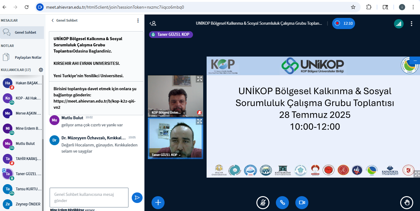 Üçüncü Toplantı Bölgesel Ar-Ge İş Birliği Çalışma Grubu ile Salı 29.Temmuz 10:00-12:00 arasında gerçekleştirildi. Toplantıda KOP, UNİKOP ve Çalışma Grubu tanıtımı ve dönem içerisinde beklentiler tartışıldı. Üyelerin katılımı ile Grup Başkanlığına Dr. Öğr. Üyesi Mahmur SARI hocamız seçildi.