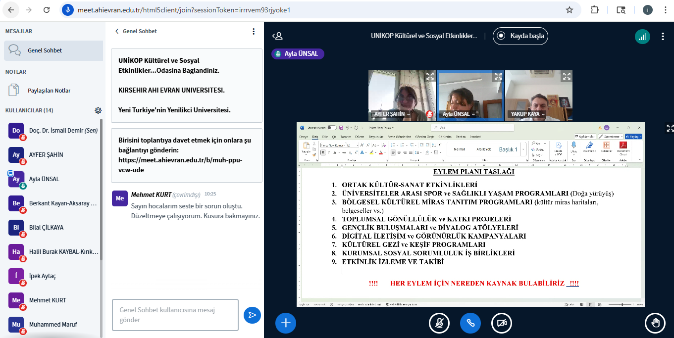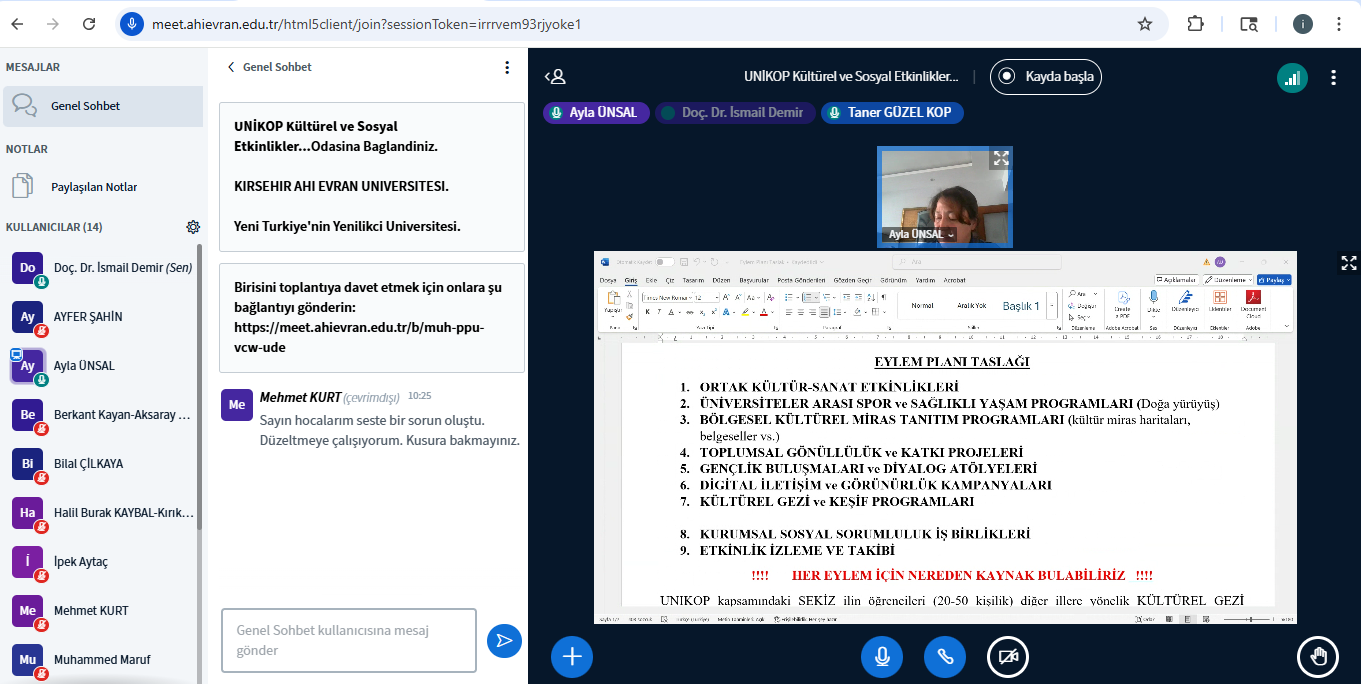 Kültürel & Sosyal Etkinlikler Çalışma Grubu 04 Ağustos Pazartesi 10:00-11:30 saatleri arasında Grup Başkanı Prof. Dr. Ayla ÜNSAL başkanlığında ikinci toplantısını gerçekleştirdi. Toplantıya Grup Üyelerinden Prof. Dr. Ayla ÜNSAL, Prof. Dr. Ayfer ŞAHİN, Prof. Dr. Berkant KAYAN, Prof. Dr. Mehmet KURT, Prof. Dr. Murat ORAL, Prof. Dr. Yakup KAYA Doç. Dr. Muhammed MARUF, Doç. Dr. Halil Burak KAYBAL, Dr. Öğr. Üyesi Navid KHALEGHIMOGHADDAM, Dr. Öğr. Üyesi Bilal ÇİLKAYA, Dr. Öğr. Üyesi Ayşe İpek AYTAÇ, UNİKOP Dönem Genel Sekreteri Doç. Dr. İsmail DEMİR, ve KOP Bölge Kalkınma İdaresi Başkanlığı Uzmanları Taner Güzel ve Özcan Ateş katılım sağladı. Toplantıda UNİKOP